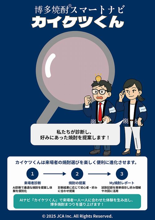 令和7年10月31日(金)~11月1日(土)に冷泉公園で「博多スピリッツ 博多焼酎まつり 50th」が開催されます。今年50周年を迎える「博多焼酎®」を通して、博多の伝統が詰まった博多部の町々から「博多」の街の魅力を発信し、街一体となって盛り上がる参加型イベントです。今回のイベントで、弊社サービス「カイケツくん」を活用した実証実験が行われます。