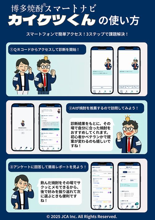 開発担当者は、「好みを聞き、傾向を把握しながら、その人にぴったりの一杯をおすすめできるようにしています。ITの力で、もっと多くの方に博多焼酎の魅力を届けたいです!」と話していました。テクノロジーで焼酎との偶然の出会いをサポートする新しい試みが、当日どのような体験につながるのか楽しみです。