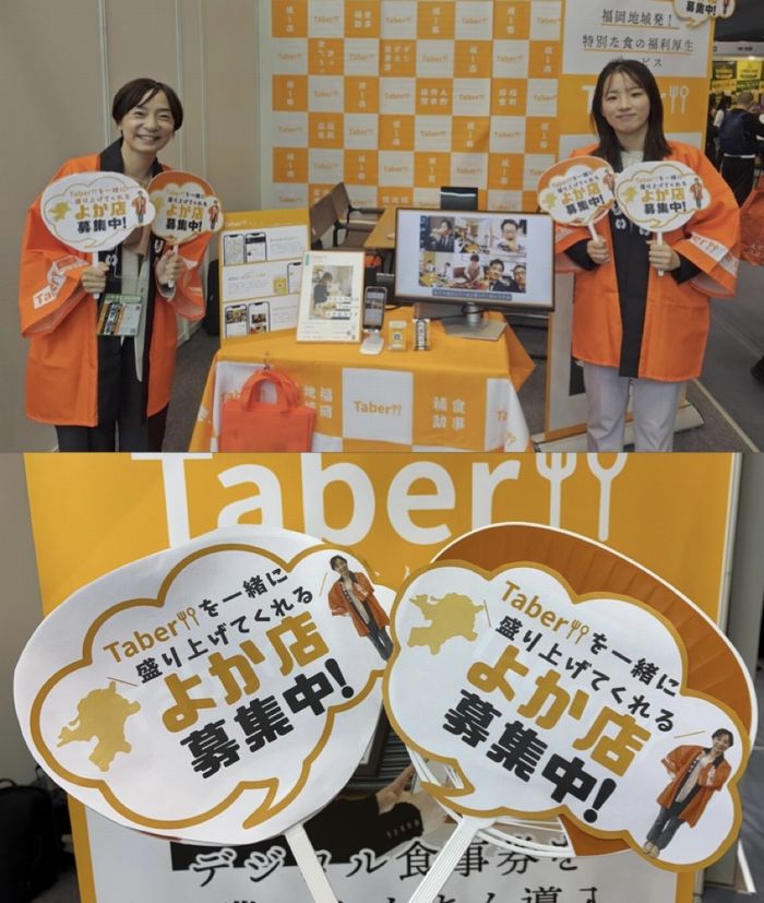 今回の展示会は、私たちの想いに共感してくださる“食”に関わる事業者の皆様とお会いすることを目的として参加しました。「Taberii」は、地域の飲食店と企業と人とのつながりを生み出し、利用するたびにつながりを深めていくことで「福岡の人たちを幸せにする」仕組みです。ブースでは、こうした背景やコンセプトを「よか店募集中!」のうちわを手にご紹介しました。多くの事業者の皆様と交流する中で、以下のような温かい言葉もいただきました。