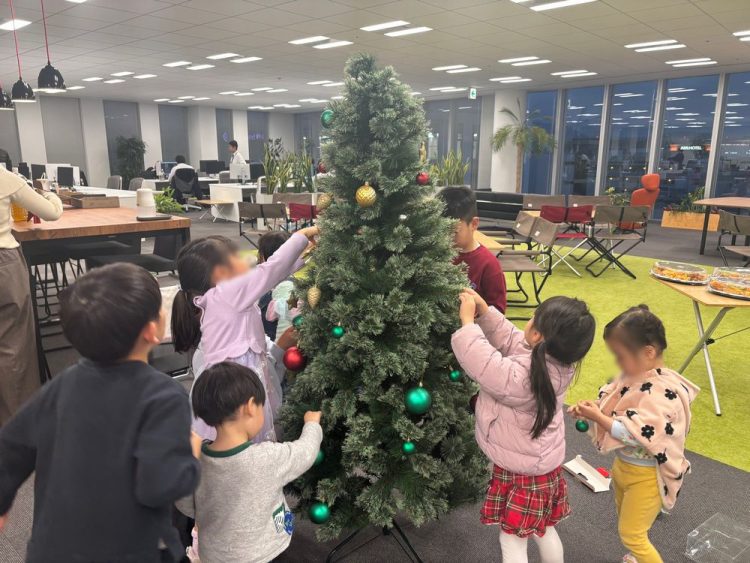 職場見学会の後は、クリスマスツリーの飾り付けを行いました。子供たちが自由に飾りを選び、大人はそばで見守りながらツリーが完成すると、オフィスが一気にクリスマスらしい雰囲気になりました。