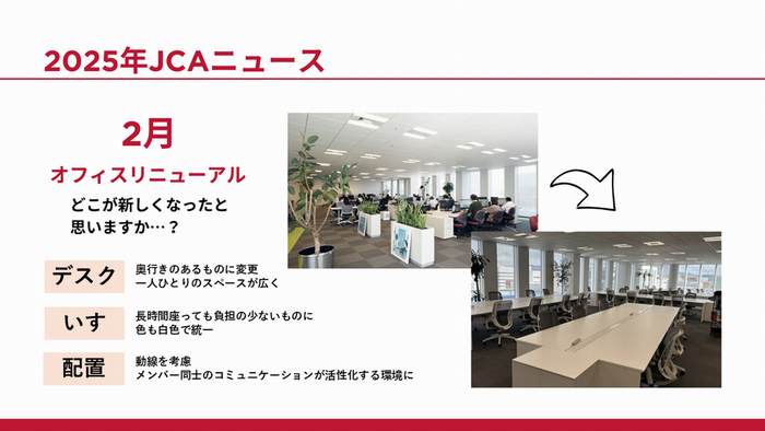 準備の過程でJCAの一年を振り返ってみると、オフィスのレイアウト変更や、「ふくおか経済」への掲載、テレビ・ラジオへの出演等、改めて「今年も濃い一年だったな…(笑)」と感じました。